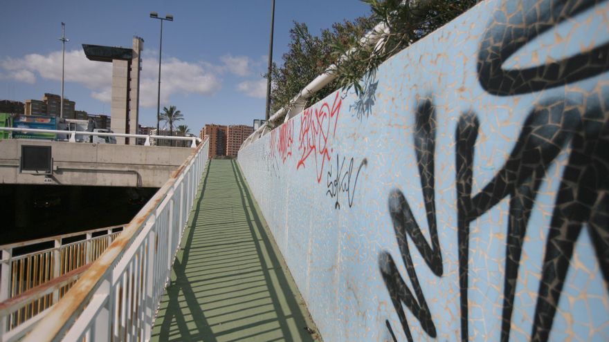 Este es el lamentable estado que presenta uno de los principales accesos a València, en concreto, la rotonda que conecta la avenida Catalunya con la autovía V-21 por la circulan cada día 52.000 vehículos, cuya torre mirador permanece clausurada y abandonada casi desde el momento en que se inauguró.