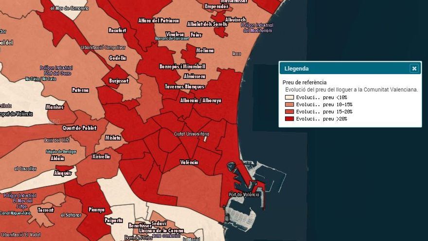 Según los datos de la Generalitat, los municipios costeros y las comarcas alicantinas son los que más han aumentado el precio del alquiler porcentualmente: por encima del 20% en dos años. En esta situación también se encuentran las ciudades del área metropolitana de Valencia y el norte de Castellón. La zona del área metropolitana de València es la que tiene un mercado del alquiler más tensionado, pero también destacan otras zonas como Alicante, Torrevieja, Dénia, Moncada o Gandia. El mapa completo se puede consultar en la web del Institut Cartogràfic Valencià. Se considera como una zona tensionada aquella en la que el precio medio ha aumentado por encima del 20% entre 2015 y 2018.