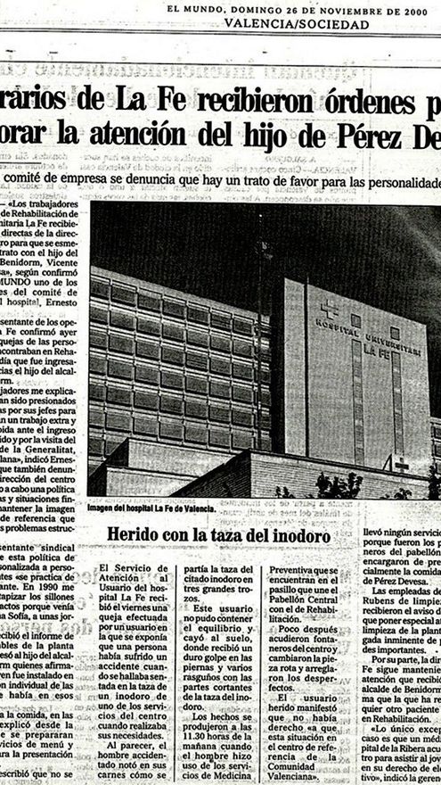 En 2000, el sindicalista Ernesto Sánchez ya denunció un trato de favor en el hospital La Fe a un cargo del PP. En concrecto al sucesor y amigo de Eduardo Zaplana, en aquella época alcalde de Benidorm, Vicente Pérez Devesa. Según la denuncia de la época, que trascendió a los medios de comunicación, se cerró una planta de hospital para el hijo de Pérez Devesa tras sufrir un accidente y en previsión de que el entonces presidente de la Generalitat acudiera a visitarlo.