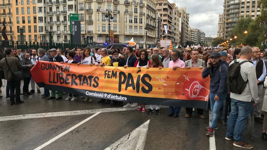 Aunque Catalunya y su “procés” han estado muy presentes en los insultos que lanzaban los contramanifestantes, la realidad es que no se han visto más de una decena de esteladas. Muchas banderas de “antifascistas” y de los partidos políticos que han asistido a la marcha: Compromís, Podemos, Esquerra Unida o ERPV. También de los sindicatos CC OO o Intersindical. Eso sí, también por primera vez en la historia ha sido mayor la marcha convocada por los antifascistas que la de la propia Comisión 9 d'Octubre.