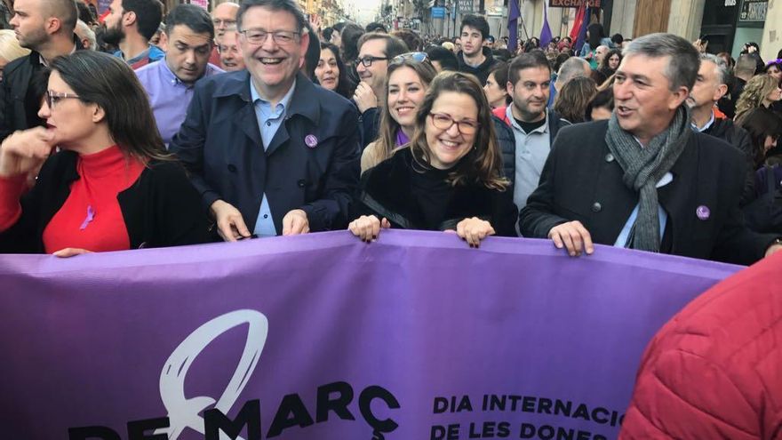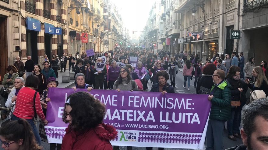 “Si les dones parem, s'atura el món” (si las mujeres paramos, se para el mundo). Ese ha sido el lema elegido por la manifestación feminista que recorre el centro de Valencia y que como reza ha conseguido paralizar la ciudad desde una hora antes de la marcha. Aunque todavía no hay datos oficiales, las cifras de participación serán históricas y a estas horas se podía hablar de decenas de miles de personas.