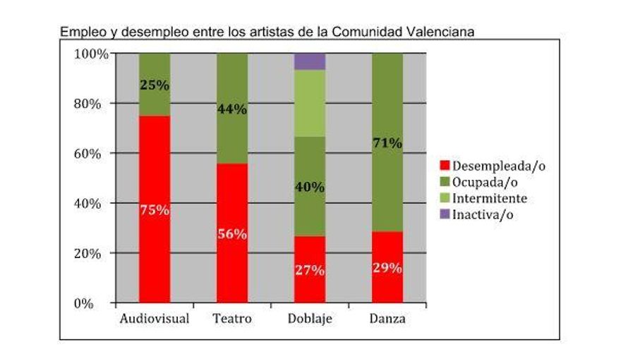 Los artistas valencianos se encuentran en una situación dramática. El 58 por ciento en paro, el 70 por ciento bajo el umbral de la pobreza y el 13 por ciento trabajan sin contrato. Es la lectura autonómica del informe sociolaboral sobre el colectivo de actores y bailarines de España, elaborado por la fundación AISGE.