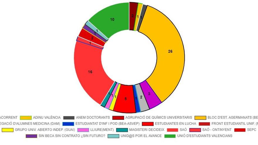 Los 17 restantes se reparten entre otras 12 formaciones; entre ellas algunas desinfladas respecto a ediciones anteriores, como Acontracorrent (cercana a EUPV) con dos alumnos, y el SEPC (Sindicat d'Estudiants dels Països Catalans), también con dos, que se situaron en puestos más delanteros en anteriores comicios.