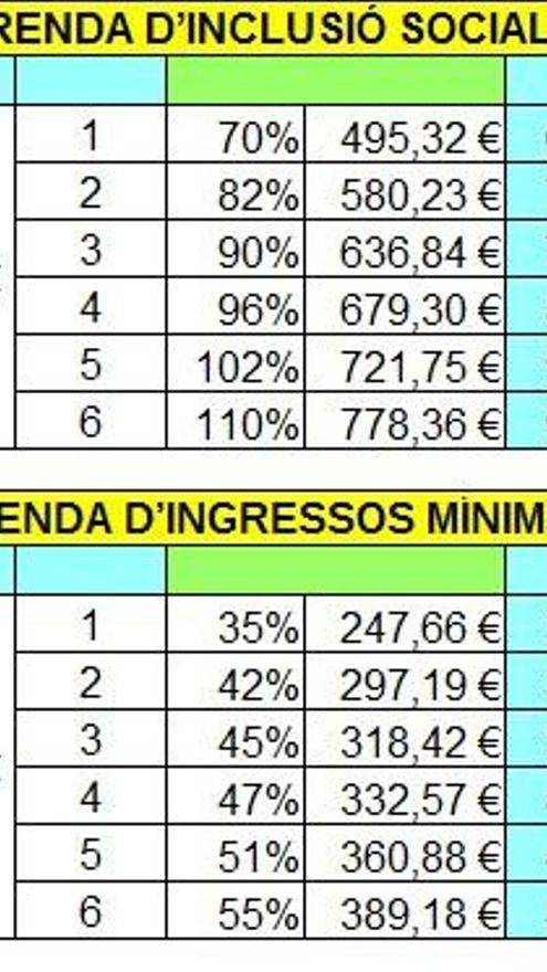 Los importes se calculan en función del salario mínimo interprofesional mensual, como se muestra en la tabla bajo estas líneas elaborada por la conselleria de Igualdad. La segunda columna se refiere al número de personas a cargo del demandante de la renta.