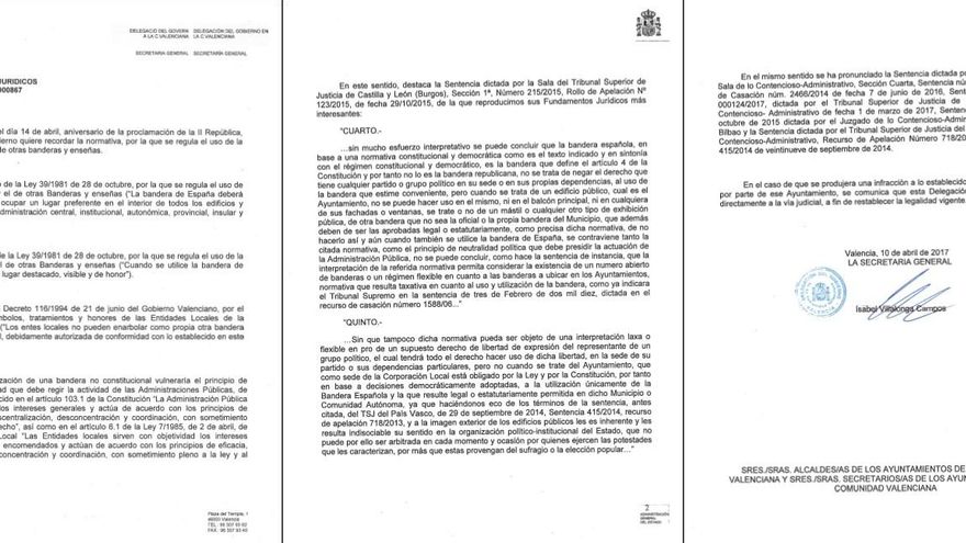 El representante del Gobierno en la Comunitat Valenciana el año pasado envió el requerimiento una vez se izaron diversas de estas enseñas, afirmando que la bandera republicana es una “provocación” y que promueve el “sectarismo” y la “confrontación y división”. Así ahora se anuncia que no habrá requerimiento y que se actuará directamente yendo a los tribunales porque “la utilización de una bandera no constitucional vulneraría el principio de neutralidad y objetividad que debe regir la actividad de las administraciones públicas”.