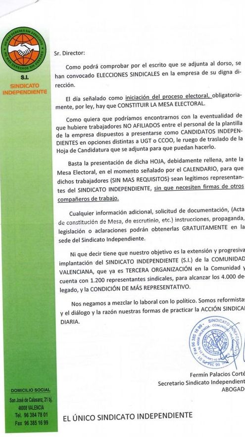 Dirigir una carta al director/gerente de una empresa, explicarle que hay elecciones sindicales y que como puede haber trabajadores interesados en presentarse como independientes, puede darles la hoja de este sindicato y que lo hagan bajo sus siglas.