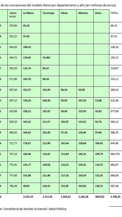 El conocido como ‘modelo Alzira’, la concesión a empresas privadas de la sanidad pública, ha facturado más de 7.500 millones de euros a la Generalitat Valenciana desde el año 2003 hasta 2018. Esta cantidad es equivalente a la mitad de todo el presupuesto anual del último ejercicio del PP en el Consell.