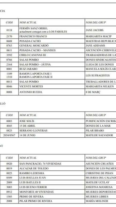Margarita Macip por Francisco Franco en Bocairent; Mujeres Libres por Primo de Rivera en Salinas; o Matilde Salvador por 14 de junio en Castellón son algunos de los ejemplos de la limpieza de nombres franquistas que todavía quedaban en viviendas de construcción pública en diversas localidades valencianas y que ahora se borrarán con nombres vinculados a las mujeres.