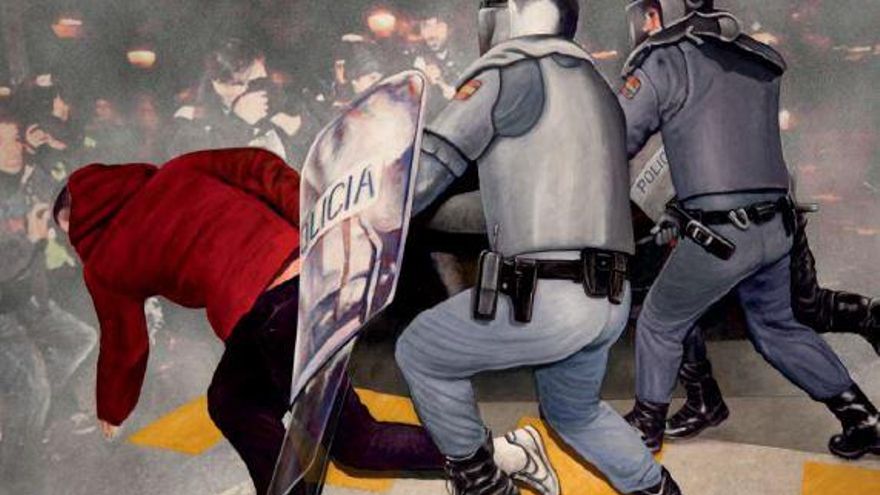 La muestra, que entonces no escandalizó a ningún político de primera línea del PP ni a ningún medio de comunicación conservador, contenía protestas de sindicatos, de la plataforma de afectados por la hipoteca, banderas independentistas, agresiones policiales y desnudos. La gran mayoría se repiten en la muestra de La Marina.