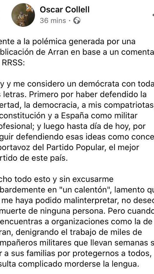 En un escrito posterior, Robles ha lamentado que se le haya “podido malinterpretar” y asegura que no desea “la muerte de ninguna persona”. “Cuando te encuentras organizaciones como la de Arran, denigrando el trabajo de miles de compañeros militares que llevan semanas sin ver a sus familias para protegernos a todos, resulta complicado morderse la lengua”, ha escrito.