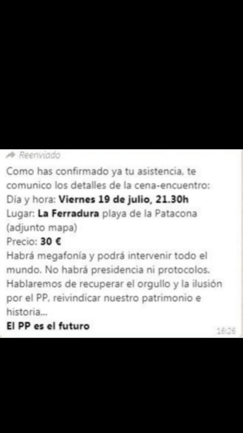 La idea del encuentro se gestó en una cena y en otra cena derivará. Plato a plato, los dirigentes apartados pretenden, según la convocatoria, que se dé entre militantes un “intercambio de opiniones” de aquellos que se sienten “orgullosos” de PP, su historia y su “patrimonio”. Todos podrán tomar la palabra en un evento que consideran “privado” pero que llega con la derrota electoral todavía templada. Los impulsores critican la situación actual del PPCV, y consideran que los malos resultados en las convocatorias electorales de abril y mayo se deben a la aplicación de la línea roja contra la corrupción de la dirección que encabeza Isabel Bonig y que tuvo como consecuencia apartar a multitud de integrantes del partido. Siguiendo la lógica de esta reflexión, son los acusados por corrupción quienes se han llevado los votos del partido, no por mala praxis, sino porque eran ellos quienes los cosechaban.