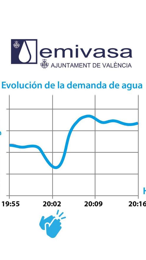 ¿Pero cuánta gente está saliendo a homenajear todos los días a los sanitarios? Muchísima. Tanta, que el consuymo de agua se reduce de manera importante durante unos minutos para volver a subir cuando la mayoría de la ciudadanía confinada empieza a hacer la cena o a ducharse tras una aciago día. “Solo notamos este tipo de variaciones cuando llega la media parte de importantes partidos de fútbol”, explica Juan José Pérez Palomar, director de Servicio de Agua Potable de Global Omnium y directivo de Emivasa, que ofrece el servicio de agua a València. Como cuando casi toda España contenía la respiración en la prórroga de la final de la Copa del Mundo de Suráfrica.