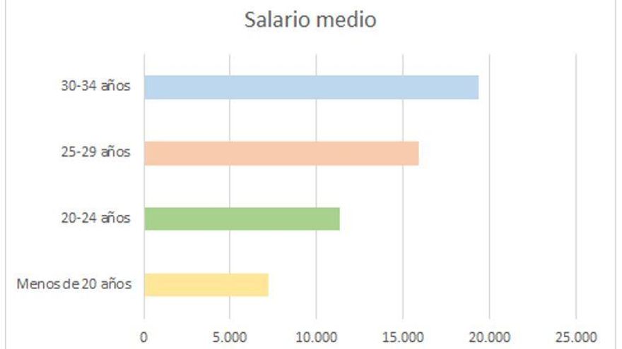 Cuando hablamos de salarios, el grupo de menores de 25 años se sitúa con una media salarial de 11.046 euros, mientras que la media nacional está en 23.156,34 euros cosa que desmotiva mucho al saber que vas a tener ingresos bastante bajos en tus primeros salarios. Pero la peor tasa, con diferencia se la llevan los menores de 20 años, como podemos ver en el gráfico.