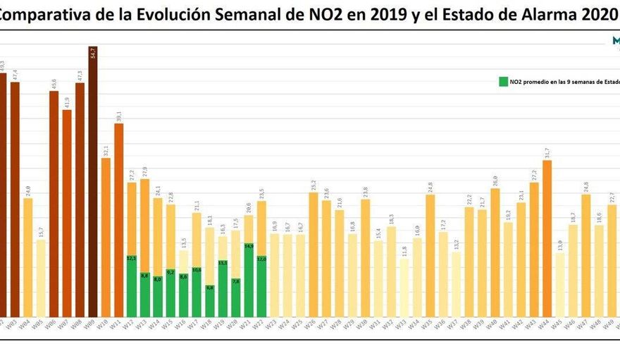 Com apunten des de la plataforma ‘València per l’aire’, aquesta reducció de gasos contaminants va arribar al 72% en les primeres setmanes de l’estat d’alarma i, posteriorment, una vegada es va reprendre part de l’activitat, van quedar els nivells de pol·lució un 60% per davall del que era habitual fins al començament del mes de març passat. Com es pot observar en la gràfica, les emissions de diòxid de nitrogen van caure notablement entre la tercera setmana de març i la segona quinzena de maig, quan va començar la desescalada a la Comunitat Valenciana.