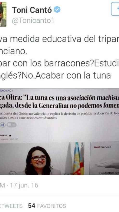 Com el muntatge en què apareixia Mónica Oltra acusant l’estudiantina de ser una associació masclista i retrògrada. Els autors de la bola van utilitzar una captura d’un mitjà de comunicació i van modificar la declaració. El diputat de Ciutadans va donar per bona la informació en Twitter i la va difondre, per bé que posteriorment va rectificar. La vicepresidenta continua rebent hui insults per aquesta fake news.