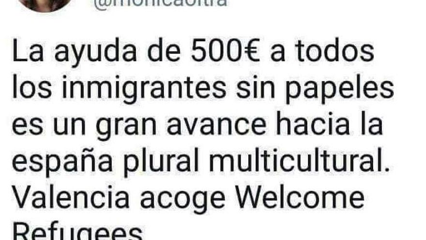 Una altra piulada falsa atribuïda a la líder de Compromís va ser usada per l’extrema dreta per a fomentar l’odi. “L’ajuda de 500 euros a tots els immigrants sense papers és un gran avanç cap a l’Espanya multicultural. València acull Welcome Refugees”, diu el comentari fals. Aquest muntatge també va haver de ser desmentit per Oltra i pels comptes “caçaboles”.