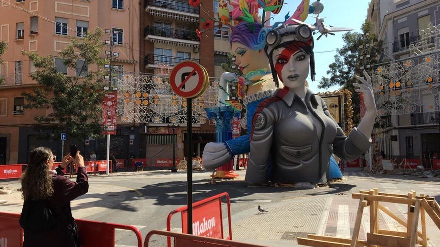 Una mujer fotografiaba el insólito monumento con su teléfono móvil. El gigantesco ninot de la Falla, que representa a una aviadora uniformada, parece devolverle la mirada con inquietud y gesto de incomprensión. Las Fallas han quedado plantadas en las calles de València sin que se sepa a ciencia cierta si llegarán en tiempo y forma a la fecha propuesta por el alcalde para el próximo mes de julio.