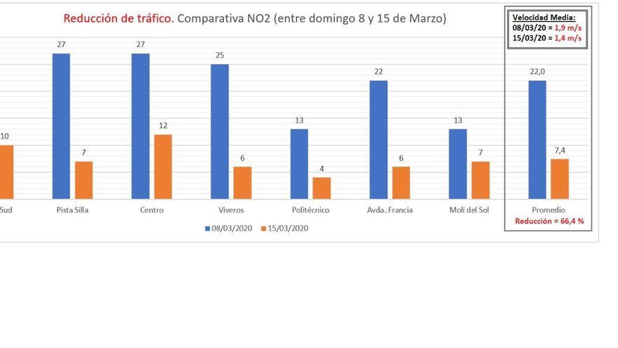 Así, el tráfico en València se redujo este pasado domingo, con la ciudad prácticamente desértica, y los niveles de NO2 han descendido un 66,4%. “Comparando dos domingo consecutivos, se ha reducido más de la mitad el dióxido de nitrógeno en la calidad del aire”, asegura Prima en conversación telefónica con eldiario.es.