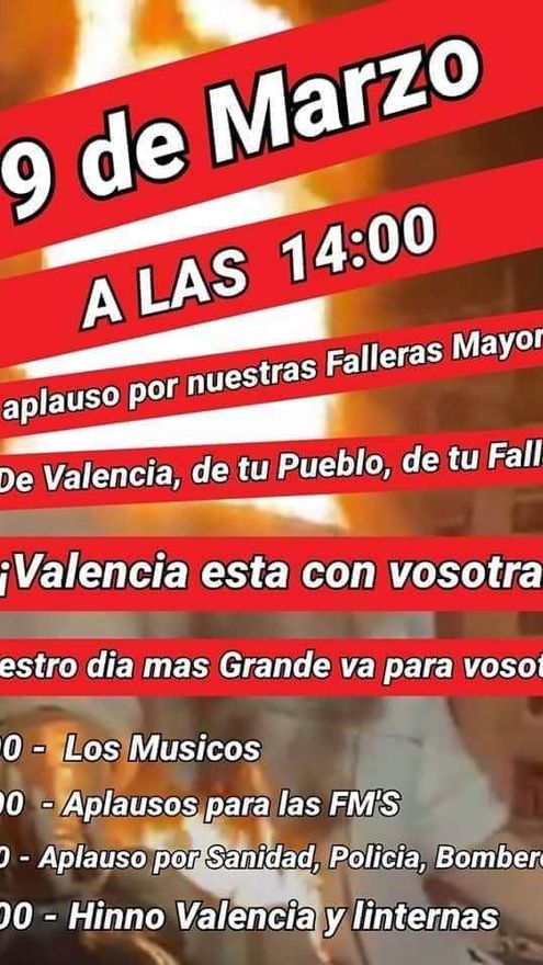 Esta es una de las iniciativas que se ha incluido en un programa de festejos que ya circula por las redes sociales y los grupos de Whatsapp. Así, además del concierto simultáneo, llama a los ciudadanos y ciudadanas a brindar un aplauso para todas las falleras mayores, tanto las de las las comisiones como las de València, a las 14.00 horas. A las 20.00 horas el habitual aplauso a los servicios sanitarios, cuerpos y fuerzas de seguridad y cualquier que sector que esté luchando en primera línea contra el coronavirus. Y a las 23.00 horas, se convoca a poner el himno regional y a encender las linternas de los teléfonos móviles.