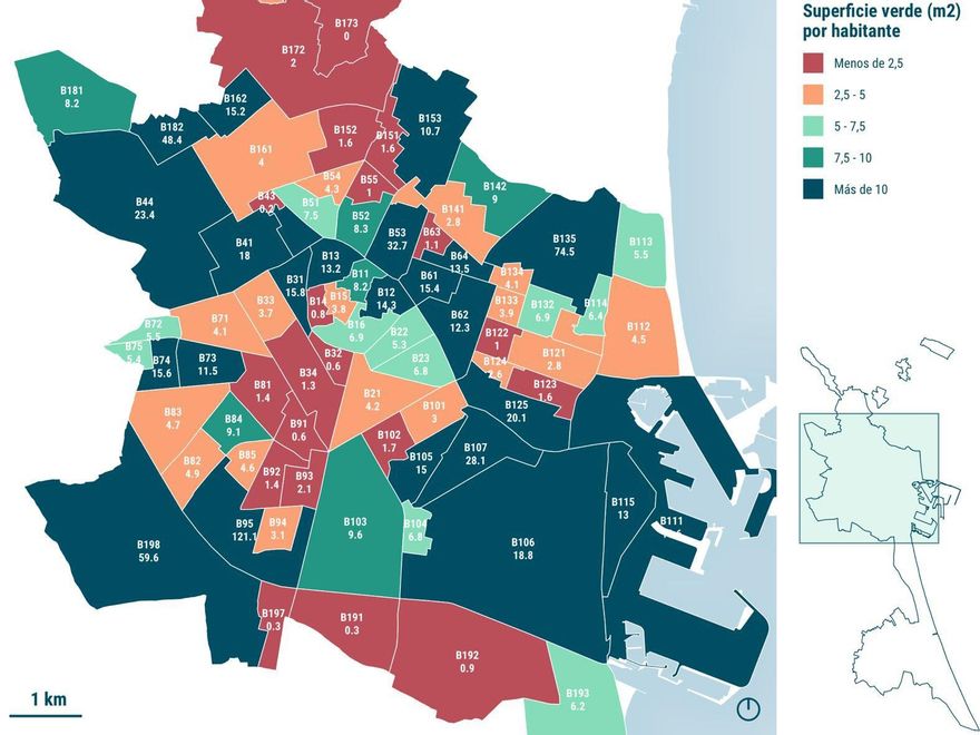 Por barrios, el vecindario de 24 barrios de València dispone de más de 10 metros cuadrados de zona verde por habitante, una cifra “deseable” según los organismos internacionales. En algunos barrios, como Campanar, Penya-roja o Trinitat entre otros, se superan incluso los 15 metros cuadrados de espacio verde por habitante. Por el contrario, 14 barrios de la ciudad están por debajo de 2’5 metros cuadrados de zona verde por vecino.