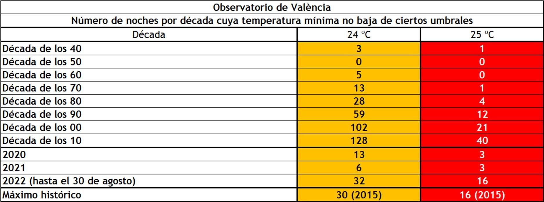 Hasta los años ochenta del siglo XX era muy raro que en València hubiese mínimas superiores a 25 grados centígrados. Desde los 70 el número de noches de más de 24 grados se duplica respecto al decenio anterior, dando un gran salto en el siglo XXI, en el que ya no se baja del centenar.