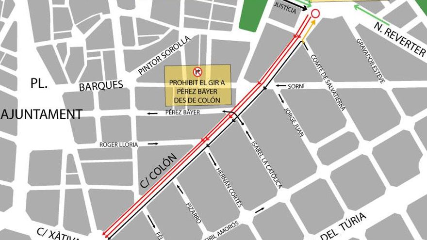 Esto obligará a su vez a cambiar de sentido el tramo de la calle Colón entre la Porta de la Mar y el cruce con Conde Salvatierra, por lo que desde la rotonda ya no se podrá entrar en coche a Colón. El objetivo de esta medida es evitar que se colapse la zona de la Porta de la Mar con coches tratando de acceder por Colón.