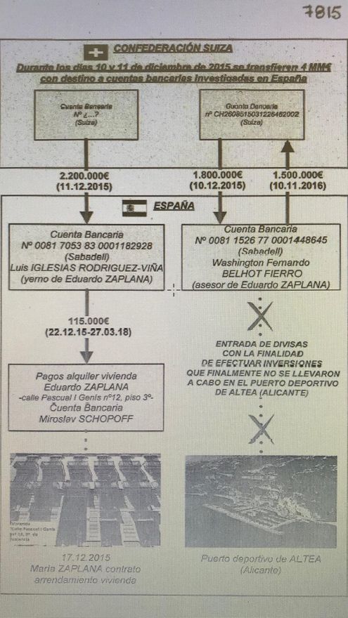 El informe de la UCO presente en el sumaria revela que un día antes de la transferencia de Suiza, el testaferro de Zaplana Fernando Belhot recibió en otra cuenta del Sabadell 1,8 millones de euros procedente también de Suiza. “Resulta especialmente llamativa esta confluencia de fondos desde Suiza (4 millones), en la misma fecha (10 y 11 de diciembre) y que parecen guardar relación con Eduardo Zaplana. Por un lado, una de ellas podría haber ido a pagar el arrendamiento de la vivienda y la otra para inversiones en el puerto deportivo de Altea”.