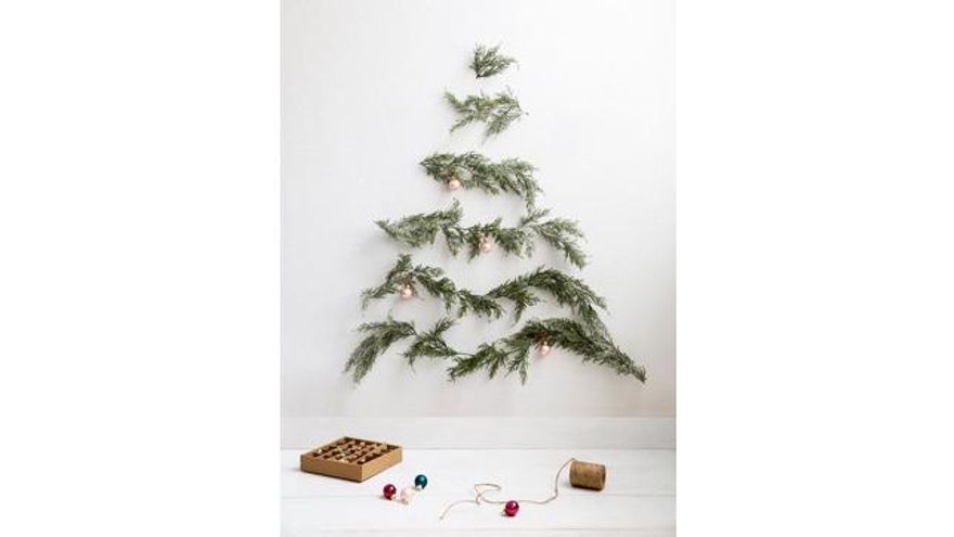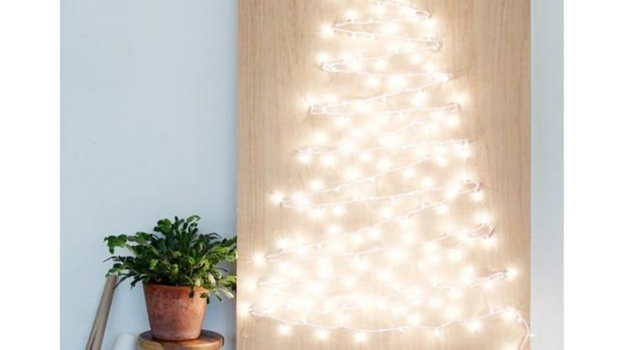 Otra opción salvavidas para espacios pequeños, y sin necesidad de cometer crímenes vegetales: crear la forma de un abeto en la pared usando solo las guirnaldas luminosas. La idea es tan sencilla que no necesita mucha más explicación; pero, también, muy resultona. Además, no roba espacio, y respeta los deseos de brillos y luces que muchos anhelamos en estas fechas.