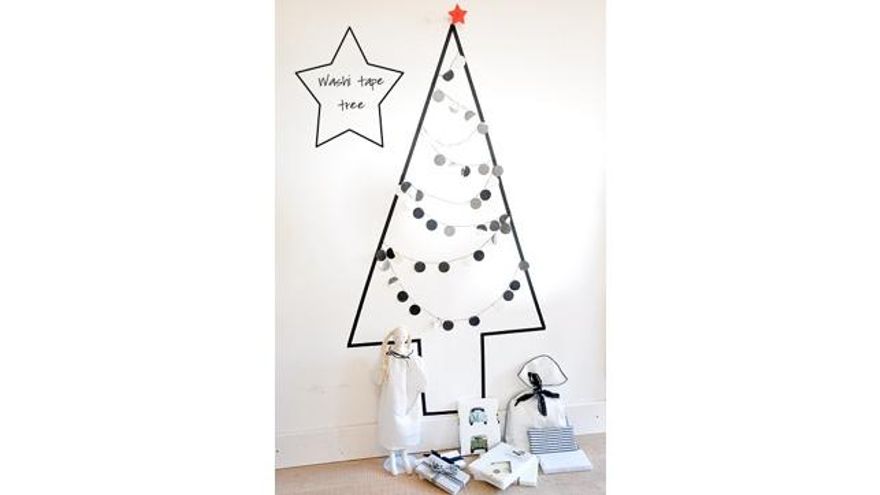 Solo necesitamos crear la silueta del árbol en la pared con la cinta adhesiva de papel; y, si queremos, decorarla con unas guirnaldas que, por descontado, también podemos pegar a la pared con otros trozos de celo. Simple, y genial.