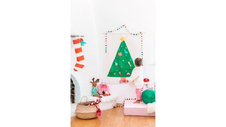 O podemos confeccionar un árbol de Navidad colgante con un tapiz de pared: un fondo de tela y, sobre este, la silueta verde (o del color que escojamos) del abeto, también de tela; todo ello, colgado con una cuerda y una vara de madera a la pared. Implica un poco más de esfuerzo, pero el resultado puede merecer mucho la pena.