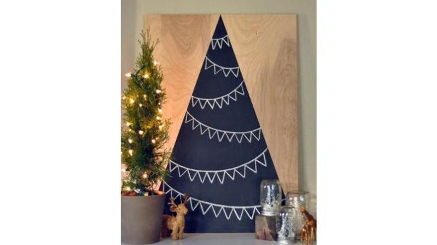 Si queremos aprovechar un trozo de madera de contrachapado más o menos grande que tengamos por casa, esta puede resultar una oportunidad perfecta. La madera sirve de lienzo o soporte para pintar sobre él la silueta de un abeto con pintura. Pero la idea sube de nivel si utilizamos pintura de tipo pizarra: solo necesitamos dibujar la silueta triangular del abeto, rellenarla con pintura de pizarra y dejar secar.