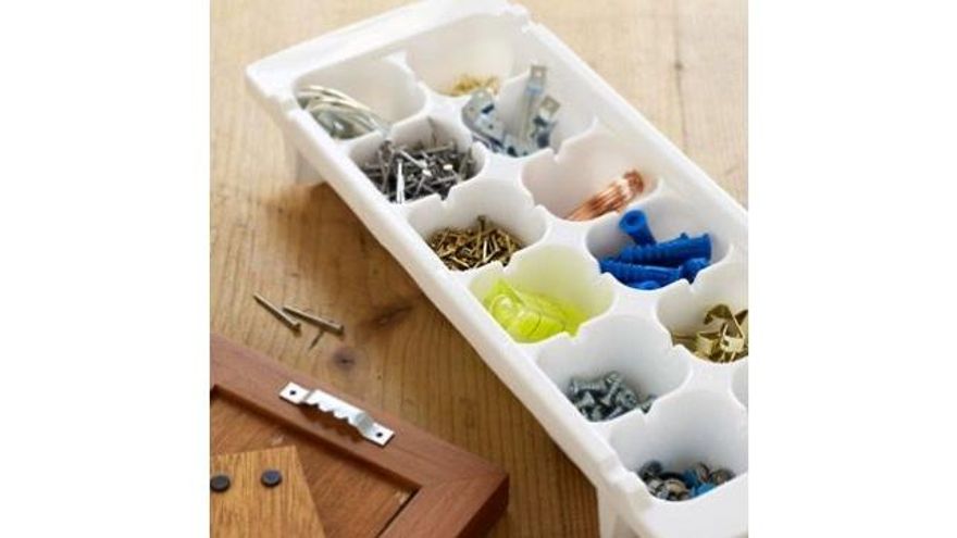 Es más: si colocamos las cubiteras en los cajones de la oficina o en el despacho en casa, tendremos sitio para poner clips, chinchetas y otros objetos pequeños similares. O para ordenar los tornillos y demás piezas pequeñas de la zona de bricolaje.