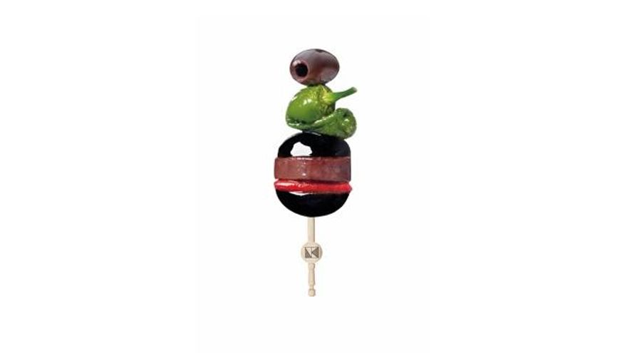 Con aceituna gordal verde rellena de un fino bacalao ahumado natural, más tomate semiseco italiano, piparra vasca encurtida y lágrima de pimiento rojo agridulce. Sabrosa.