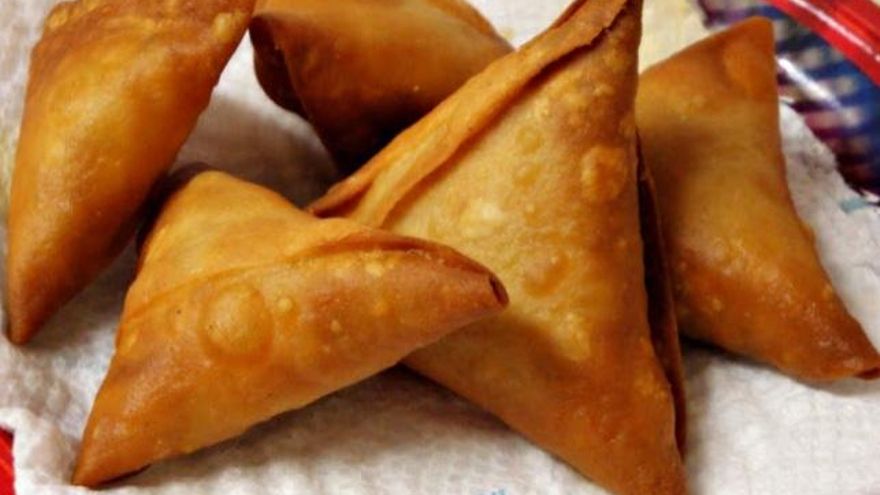 Recupera las bolitas de masa para poder cortarlas por la mitad y, con un rodillo, estíralas y humedécelas con un poco de agua por los bordes. Luego, con una cuchara, ve repartiendo el relleno por el centro de la masa, cerrándolo como una empanadilla para formar una especie de triángulo. Fríe hasta que obtengas un color dorado.