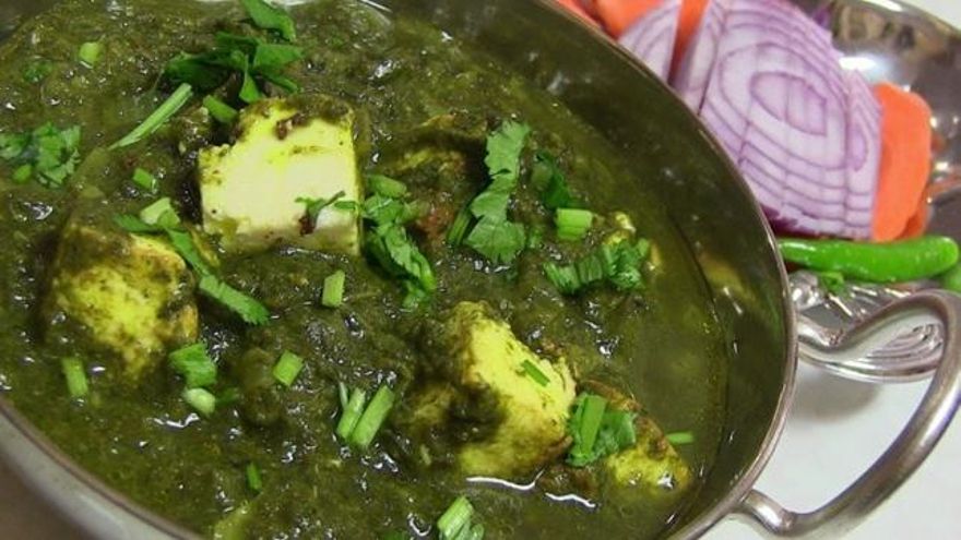 Lava 350 g de espinacas y hiérvelas durante un minuto en una olla. Escúrrelas bien y colócalas en un bol con agua fría durante tres minutos. En una batidora, echa la espinaca bien escurrida con dos dientes de ajo y un trozo de jengibre pelado hasta hacerlo puré. En una cacerola, coloca dos cucharadas de mantequilla clarificada o ghee, media cucharada de comino, una hoja de laurel, media cebolla picadita y sofríe hasta que esté todo dorado.