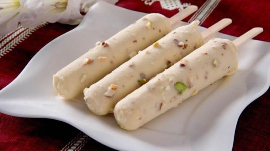Este helado típico indio es supercremoso. Mezclas, en un tazón, 10 g de harina de maíz con 20 ml de leche y reservas. En una sartén, llevas a ebullición 200 ml de leche y 100 ml de leche condensada y agregas unas hebras de azafrán y 30 g de azúcar; cuando todo esto hierva, le unes la amalgama de harina con leche, dejando en ebullición durante cinco minutos más. Lo retiras y echas tres cucharadas de almendras y pistachos. Una vez esté frío, lo distribuyes en vasitos de helado y los dejas congelar.