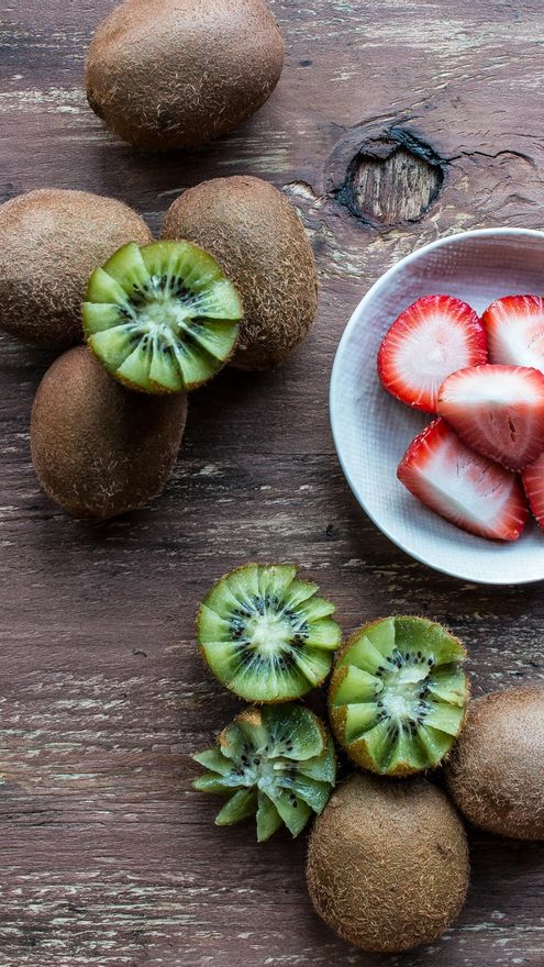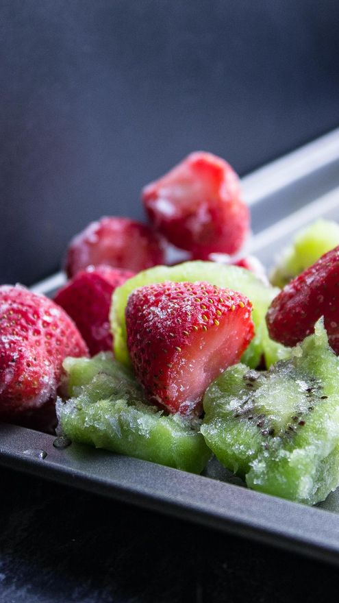 Una vez que se haya congelado, saca las frutas del congelador y sepáralas en dos cuencos pequeños, fresas por un lado, kiwis por otro.