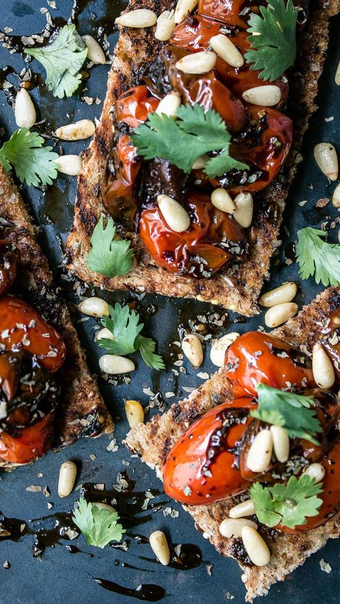 Coloca las rebanadas de pan tostado en un plato de servir y añade la mezcla de Caprese en la parte superior de cada rebanada. Espolvorea la parte superior con piñones tostados y, ¡a disfrutar!