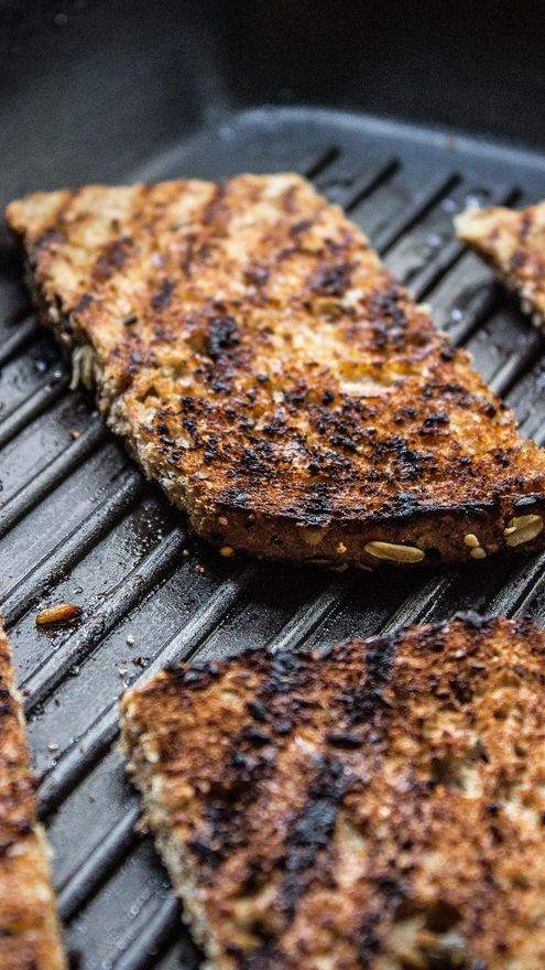 Pon una sartén grill a fuego alto. Echa el aceite de oliva en ambos lados del pan y coloca las rebanadas en la sartén, hasta que se tuesten. Entonces, saca el pan y frota ambos lados del pan con los dientes de ajo.
