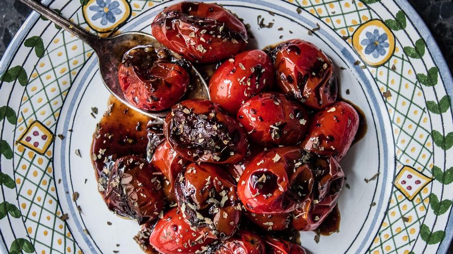 Una vez que el aceite se caliente, añade los tomates cherry, vinagre balsámico y albahaca seca. Saltea hasta que los tomates se hagan. Espolvorea por encima la sal, el orégano y la pimienta negra y reserva para el montaje posterior.