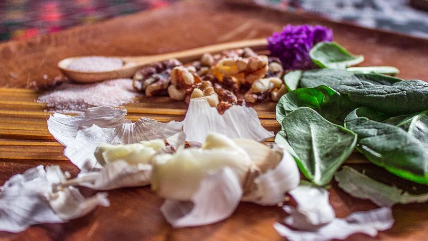2. Entre tanto, comenzamos a hacer la salsa de pesto con espinacas y nueces