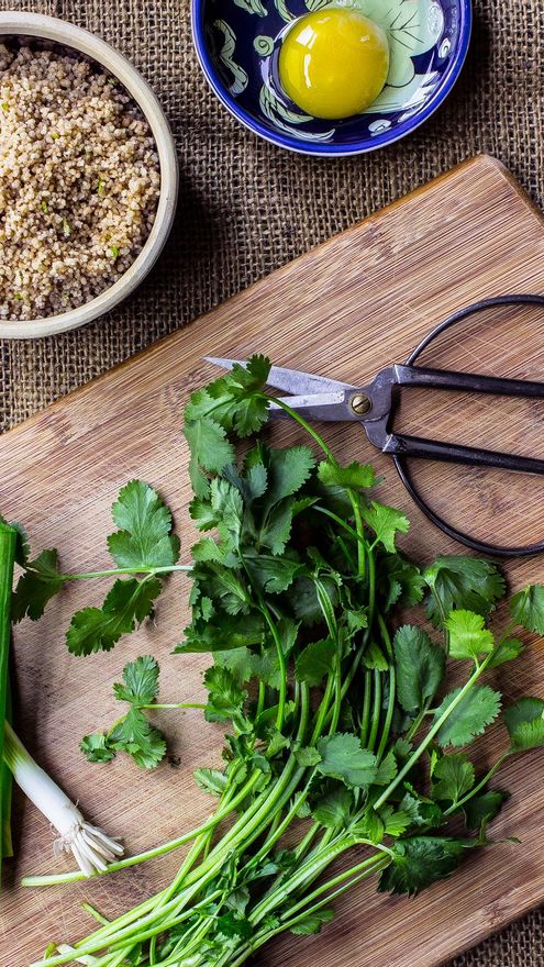 1. En un bol mediano, mezcla el cuscús, el cilantro, el cebollino, el huevo, el pimentón, el comino, la ralladura de lima, la sal y la pimienta