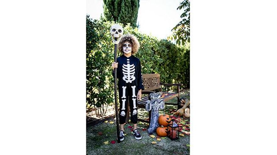 Un original estilo de esqueleto que, en vez de ser un mono enterizo, es un hábito con una calavera en el estómago. Sencillo y sobrio, si a tu hijo no le van las estridencias, esta sin duda es tu opción. Le pintas la cara y a disfrutar todos de la fiesta.
