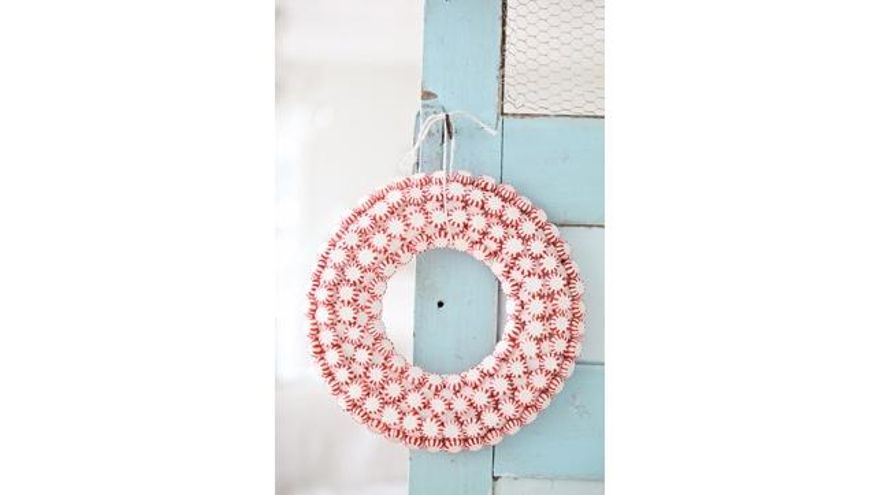 A veces lo más sencillo resulta la mejor opción. Y, también, puede ser la más sabrosa, como demuestra esta corona navideña de caramelos. Para que tenga más relieve, podemos utilizar un marco de corona de espuma de poliestireno blanco; o hacernos nuestra propia base circular de cartón y pintarla con pintura de color blanco en aerosol.