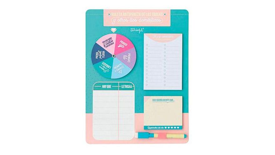 Esta pizarra porta un rotulador de tinta borrable y una ruleta para asignar a cada miembro de la pareja las tareas del hogar que toquen cada semana. Y con el mismo propósito de organización en equipo, lleva un bloc de notas para la lista de la compra y otro de notas adhesivas para dejarse mensajitos por toda la casa.