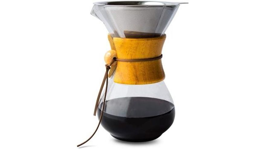 De nuevo una jarra de borosilicato y una abrazadera de madera, que además incorpora un filtro propio de micro-malla de acero inoxidable que hace prescindible el filtro de papel.