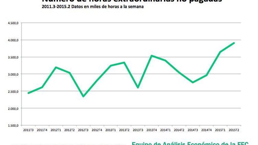 4) Todos los nuevos contratos disponen de menos derechos laborales y de menor intensidad que los anteriores a 2010, debido a las reformas laborales llevadas a cabo por los gobiernos del PSOE y del PP. Los contratos indefinidos son una reliquia, porque hoy día apenas hay diferencia entre este tipo de contratos y los contratos temporales en materia de indemnización por despido y otras características. Además, cada semana hay casi 4 millones de horas extraordinarias que no se pagan (si esas horas se trasladasen a nuevos empleos a tiempo completo hablaríamos de la generación de 100.000 puestos de trabajo), y la tendencia es desgraciadamente ascendente.