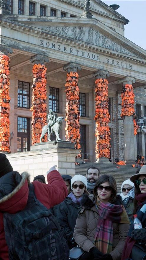 Cientos de los chalecos salvavidas naranjas usados por los refugiados para alcanzar las costas europeas cubren este domingo las columnas del teatro Konzerthaus de Berlín, como parte de una instalación del artista y activista chino Ai Weiwei en recuerdo a las millones de personas que huyen de la guerra.