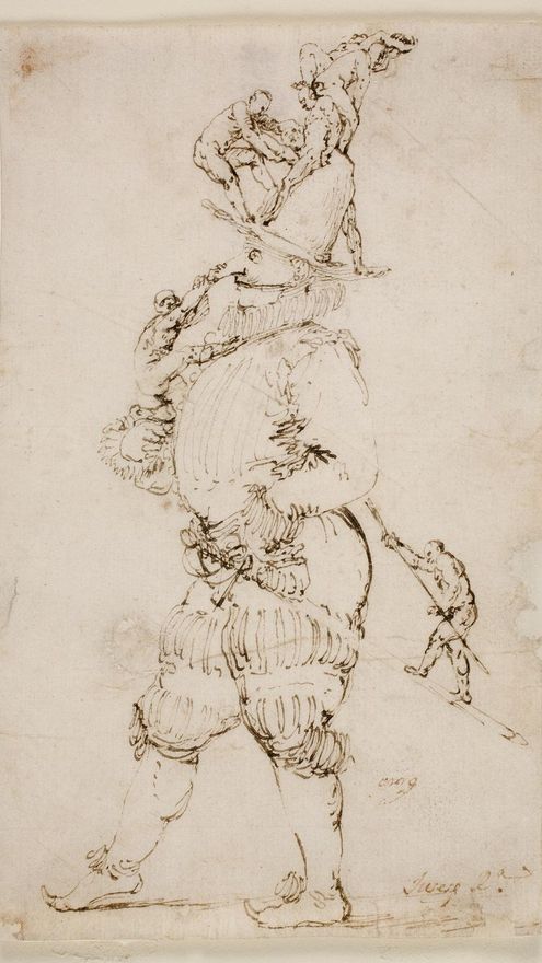 Hay de todo, excepto ocasión de aburrirse, porque no solo es que los dibujos vayan de una Santa Cecilia (h. 1640) a un curioso Caballero con hombrecillos subiendo por su cuerpo (finales 1620s), sino que las técnicas y materiales pueden ser muy diferentes. Hay dibujos tan complejos y acabados como el Santo atado a un árbol (1626) que son sanguina casi escultórica, otros como Estudios de Tizio (com. 1630s)que son pluma y aguada apenas indicados, mientras en otros como la Adoración a los Pastores nocturna (princ. 1640s) alterna lápiz negro y sanguina con aguada parda y gris con realces de blanco. Que ya es elaborar un dibujo. No se trata de una evolución homogénea en el tiempo, porque esa variedad se produce en todas las épocas.