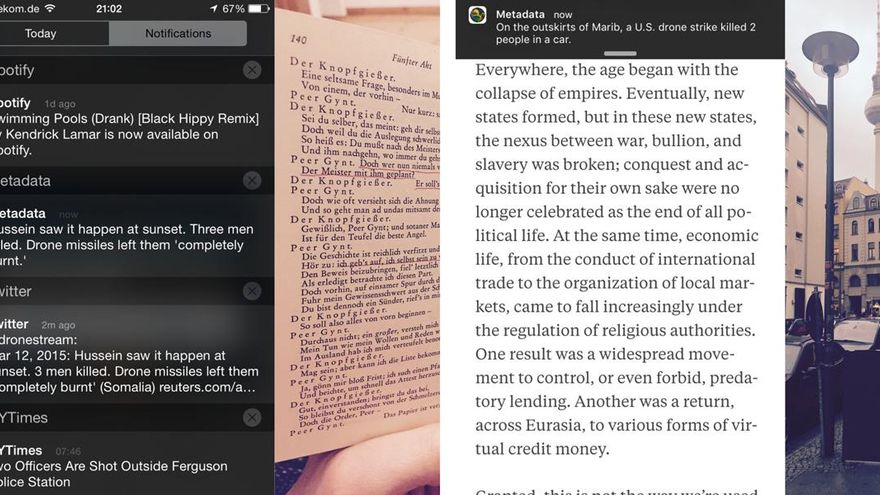 Era uno de los mensajes de la aplicación Metadata, obra del estadounidense Josh Begley. La aplicación informa a través de notificaciones cada vez que se da a conocer la existencia de un ataque de un dron estadounidense. Junto a una captura de pantalla de ese mensaje, Behroz sitúa en un sencillo collage una fotografía del lugar en el que se encuentra en el momento de leer dicho texto.